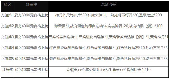 2.活动时间内充值总额满1000元以上的玩家可参与竞争前5名的排行榜奖励