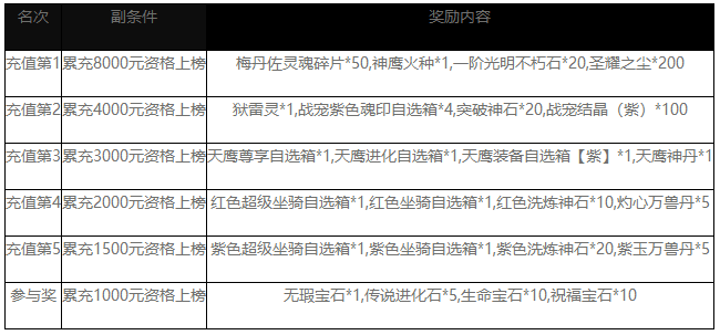 2. 活动时间内充值总额满1000元以上的玩家可参与竞争前5名的排行榜奖励