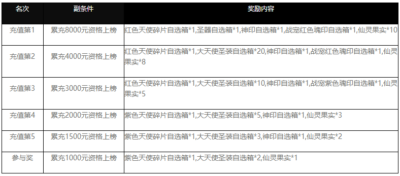2. 活动时间内充值总额满1000元以上的玩家可参与竞争前5名的排行榜奖励