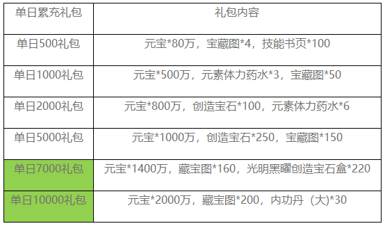 2、单日累充达到高档位同时也可领取低档奖励(例如单日累计充值10000元可以领取10000元和其他档位道具,以此类推);