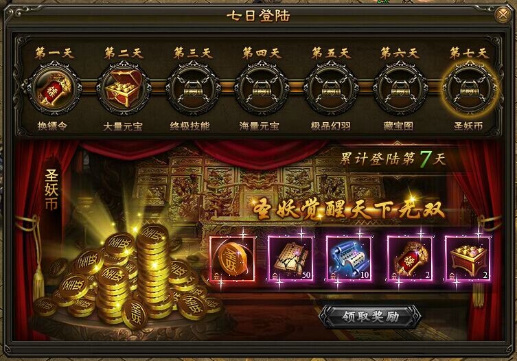 第7天登录:奖励1个10000圣妖币、50个天书残片(中)、10个炼狱剑法残页、2个换镖令、2个元宝匣(绑定)。