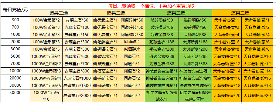 活动期间历史累计充值达到固定档位即可领取奖励,(如达到5000充值,即可领取3000+5000充值奖励)活动期间每个档位仅能领取一次。